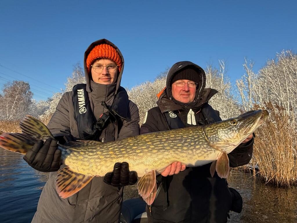As the snowfall intensified, the boat and crew slowly disappeared under a white veil. It was harsh, difficult fishing, but also mesmerizing. Smaller softbaits on light jigheads, fished tight to the bottom, eventually produced more fish. The highlight was a stunning winter pike just after the snow stopped, under a pale blue winter sky — just shy of one meter and around 15 lb, the second-largest pike my guest had ever caught.